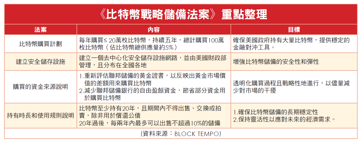 通過將比特幣納入國家資產儲備,法案希望為美國提供一種對抗經濟不確定性和貨幣不穩定性的有效工具,而比特幣作為一種去中心化和有限供應的數字資產,具有獨特的抗通膨和避險功能,並且提供類似黃金的價值儲存功能,不僅可以增強國家的金融彈性,還能在全球金融創新中保持領先地位,確保美國在未來的經濟競爭中處於有利位置,並促使「數位黃金」實際運用的實現!