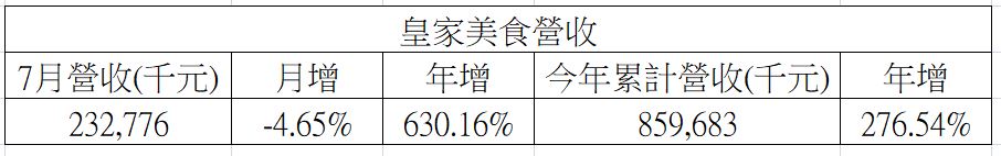 雖然營收年增很可觀,但單看營收月增,表現卻不理想,皇家美食7月最新營收為2.3億元,月增-4.65%,年增630.16%;今年1到7月營收為8.5億元,年增276.54%。