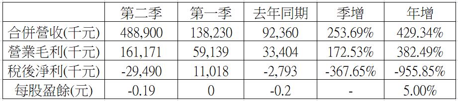第二季合併營收4.8億元,季增253.69%,年增429.34%;營業毛利1.6億元,季增172.53%,年增382.49%;稅後淨損2949萬元,季減367.65%,年減955.85%;每股盈餘(EPS)-0.19元,年增5.00%。