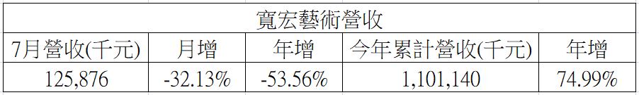 寬宏藝術7月最新營收為1.2億元,月增-32.13%,年增-53.56%;今年1到7月累計營收為11億元,年增74.99%。