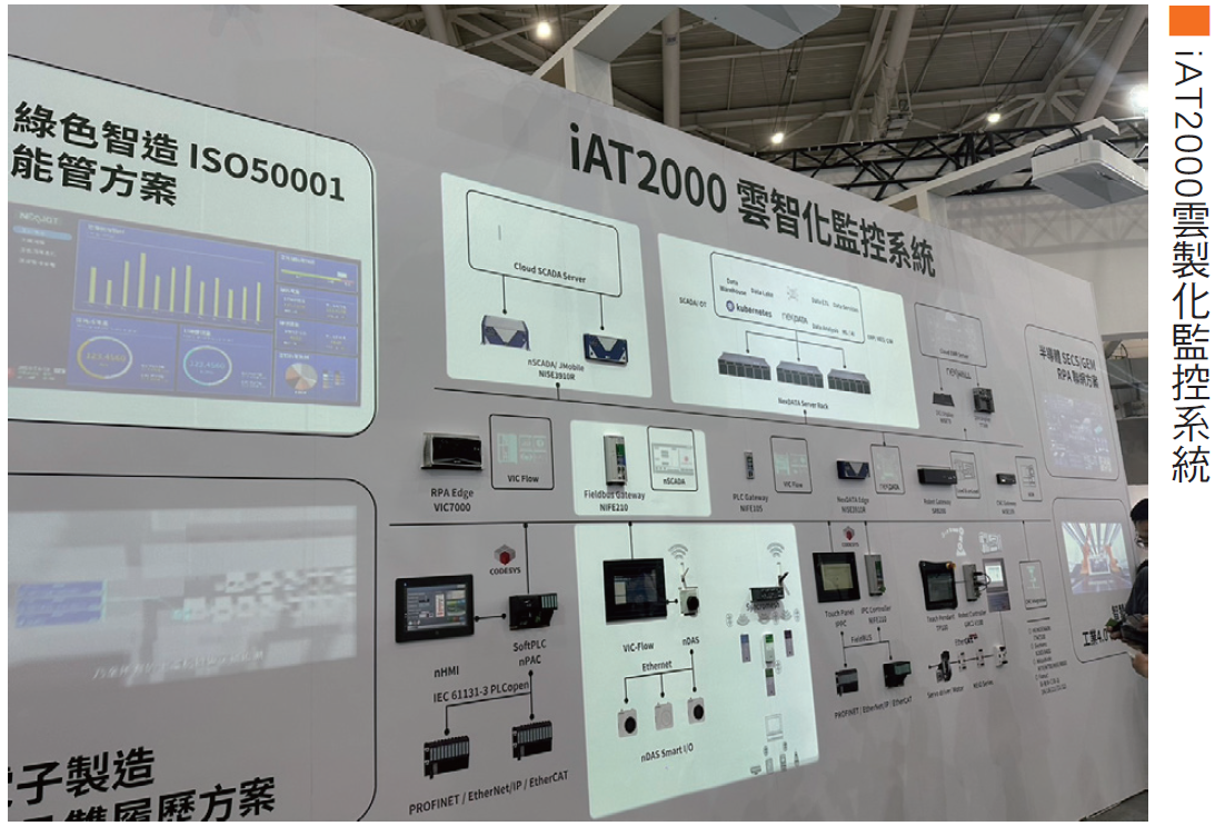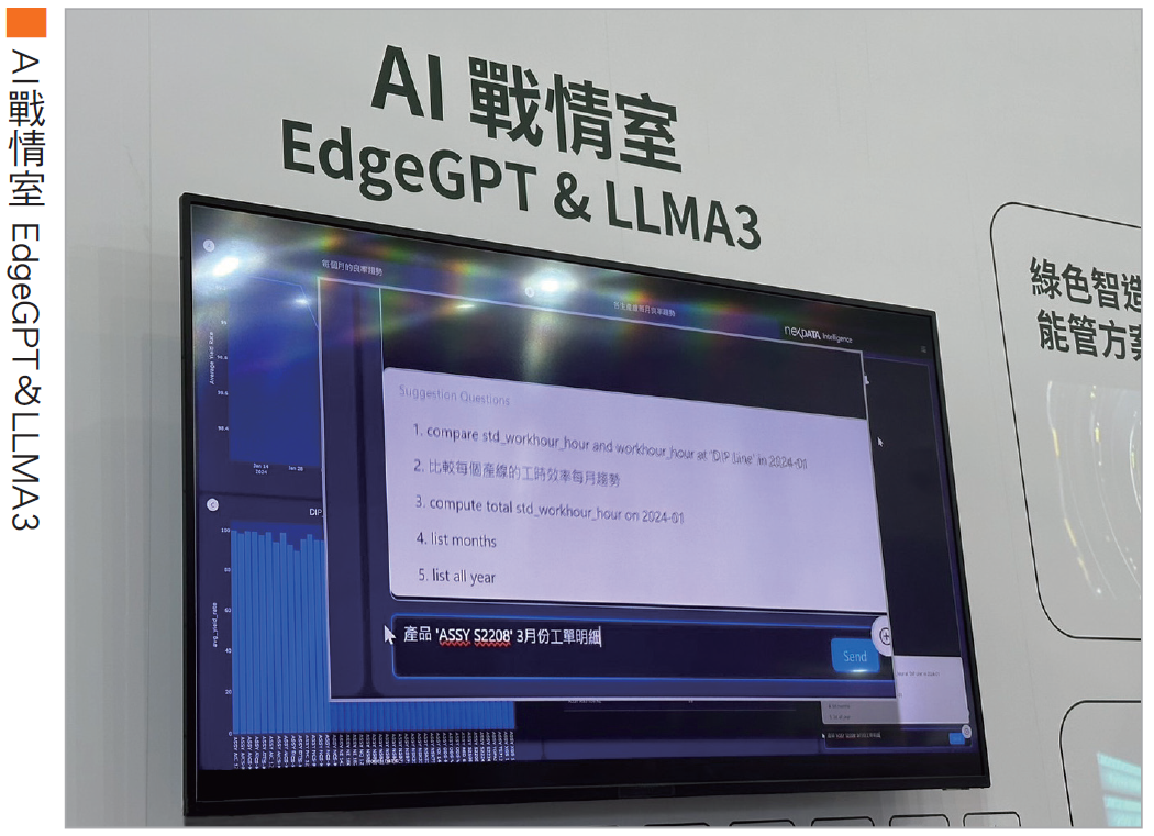 新漢集團(8234)旗下新漢智能此次展覽以「iAT2000雲製化監控系統」及「AI戰情室 EdgeGPT&LLMA3」為主力銷售產品,展現出物聯網的進步。iAT2000系統可控制各種生產設備、機台,並加入AI軟體,做出策略分析;AI戰情室則是可以監測工廠的良率,找出下降的原因。