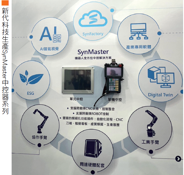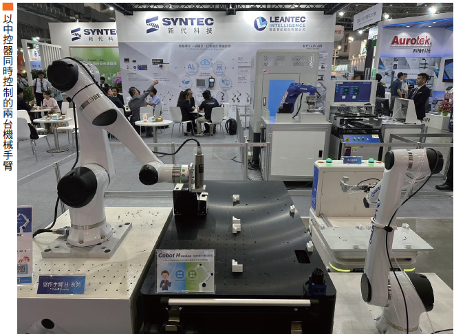新代科技(7750)現場展示了以中控器連結的兩台機械手臂,新代總監黃芳芷說:「我用機器人控制一群機器人。」有別於過往仍需指派人員去一台台監控機器作業,更能做到省時省力。新代科技以工具機的控制器起家,格外了解工廠的OT(技術操作),各產業的OT大相逕庭,而新代科技的控制器皆可廣泛應用。
