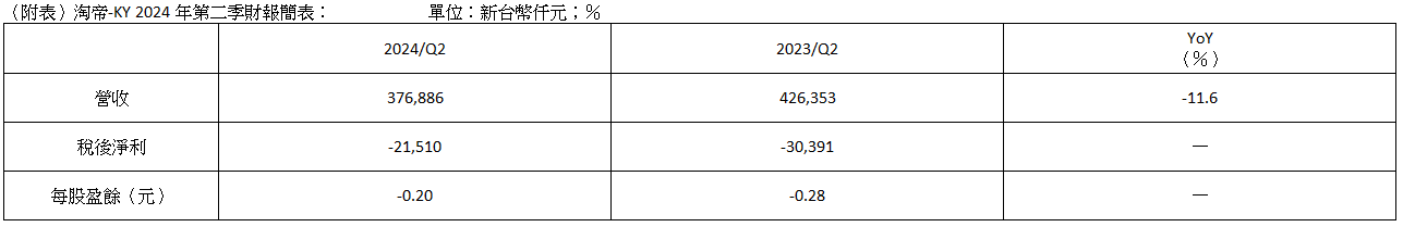 淘帝國際有限公司(2929)於今日公佈2024年第二季合併營收為新台幣3.77億元,雖受到中國整體消費動能減弱、以及旗下代理商拉貨力道轉為保守,使第二季稅後淨損0.22億元、每股稅後虧損(EPS)為0.20元,第二季營運仍較去年同期虧損明顯收斂。