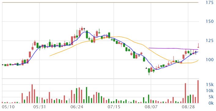 電機股鈦昇(8027)今(3)日盤中爆量,股價跳空開高開在116.0元,盤中最高觸及121.5元後震盪向下,目前股價暫報116.5元,漲幅5.43%,截至上午10點45分成交量為18506張,量增502%。