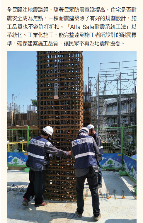 經研究發現,房屋是否耐震安全,最重要也是最難做到的原因,在於鋼筋是否按照規定的設計圖說施工與綁紮,在地震頻繁且居住安全風險高的時候,透過「建築安全履歷協會」所推廣的耐震系統工法施工,將鋼筋一體成形鋼筋彎折而成,運用「鋼筋系統化的設計規劃」及「自動化加工技術」,讓施工品質達到設計者的要求,可有效改善建築業缺工及施工品質不易確保的困境。