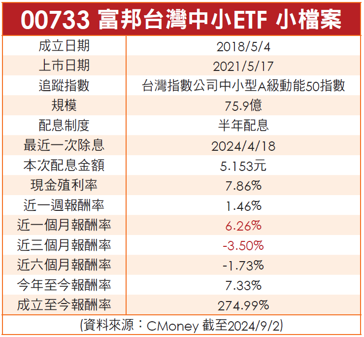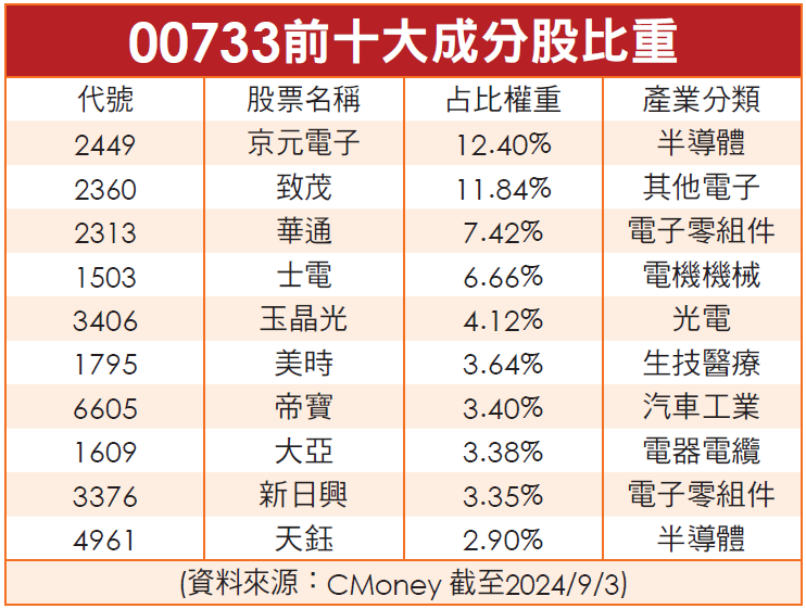 00733主要投資具有成長動能的中小型股,成分股涵蓋的產業別主要為電子類,追蹤指數扣除了台灣前50大市值的上市股票,鎖定成長動能高的中小型企業,再根據「平均成交量」、「平均週轉率」和「報酬率」為篩選條件,從籌碼面中挑選被大戶關注的中小型股,等待市場動能而賺取高報酬,適合想賺取資本利得的投資人,但較不適合想穩定賺取股息的存股族,投資時要小心中小型股股性活潑,漲跌幅度較大導致風險相對較高,且手續費用相對其他市面上的ETF高出一些,提醒投資人進場時需酌情考量。