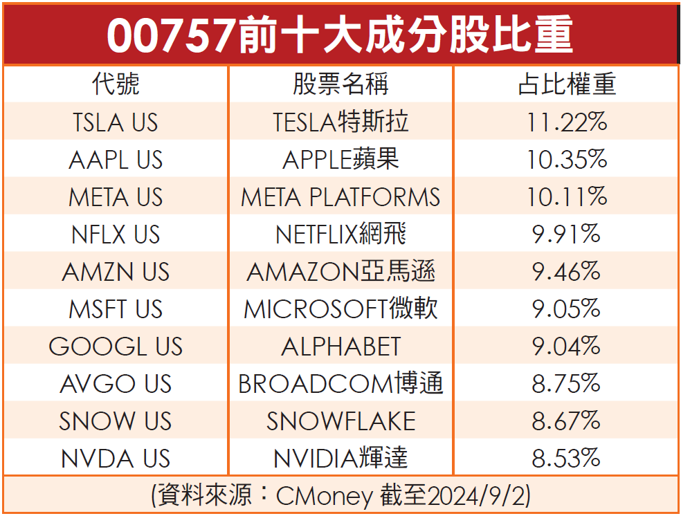 00757為海外ETF人氣王,投資標的為在美國上市且具高度成長性和市場關注度的科技股和非必需消費股,投資領域涵蓋了社群媒體、電商、人工智慧、物聯網、電動車等科技領域,成分股皆為美國的科技巨擘,瞄準高成長的創新科技公司,很適合追求市值成長的投資人,可以用相對較低的價格且免換匯的方式來投資世界級科技龍頭,但因美股無漲跌幅限制、波動率高,風險也相對較高,且投資產業較集中科技類,須留意景氣循環的影響。