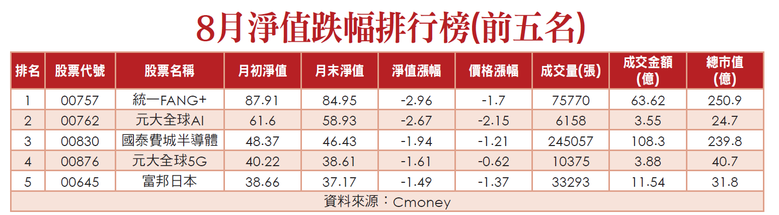 根據CMoney數據統計所製8月淨值跌幅排行榜,表中可見5檔中有4檔是主打全球或美國的科技型ETF,其中成分股大多以美股占多數,回顧整個美股8月,月初發布的7月非農就業報告表現不如預期,一度引發市場的劇烈波動,甚至造成經濟衰退的恐慌,好在隨後幾周的經濟數據較為強勁,逐漸消除投資者的疑慮,市場情緒也隨之穩定下來。