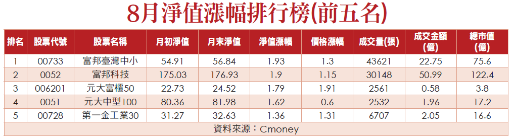 根據CMoney數據統計所製8月淨值漲幅排行榜,表中可見5檔中有3檔是主打追蹤中小型個股的ETF,包括榜首00733、探花006201跟傳臚0051,中小型股意指台股中市值排名50以後的個股,中型為第51~150名,小型則為第151~450名。