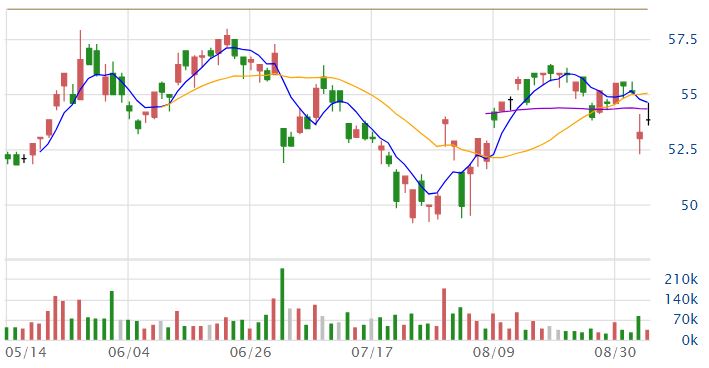 半導體股聯電(2303)昨(4)日遇半導體股災,慘遭賣壓,盤中下跌3.27%,今(5)日股價雖有回升,但由於8月營收無特別亮眼,故漲勢疲弱,漲幅不到2%。聯電今日開盤價53.9元,盤中維持震盪,終場以23.9元作收,漲幅1.13%,今日成交量為37677張。