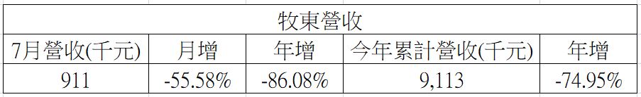 7月營收為91萬元,月增-55.58%,年增-86.08%,連續3個月衰退;今年1到7月累計收為911萬元,年增-74.95%。