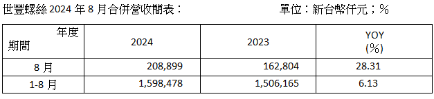 螺絲大廠世豐螺絲股份有限公司〈2065〉最新公布2024年8月合併營收達2.09億元,呈現月增2.87%、大幅年增28.31%表現,創造單月營收已連續五個月繳出年增正成長水準。累計2024年1至8月營收達15.98億元,同步較去年同期成長6.13%。