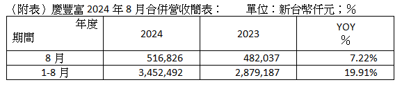 居家生活用品的全方位供應商慶豐富實業股份有限公司(9935)最新公布2024年8月合併營收達5.17億元,創歷年同期次高水準,年增7.22%。累計2024年1至8月合併營收34.53億元,年增19.91%。