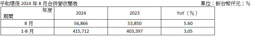 平和環保科技股份有限公司(6771)於今日公告8月合併營收5,687萬元,創近21個月新高,較去年同期成長5.60%,亦較上月增加13.90%;累計1-8月營收4.16億元,年增3.05%。景氣平穩下偶有波動,平和環保表示,8月下游客戶生產量增加,公司廢水代處理量及營收亦隨之增加。公司表示,目前看來總體經濟尚且穩定,但下游客戶產業復甦步調不一,公司仍審慎因應並持續拓展新客戶,維持營運成長。