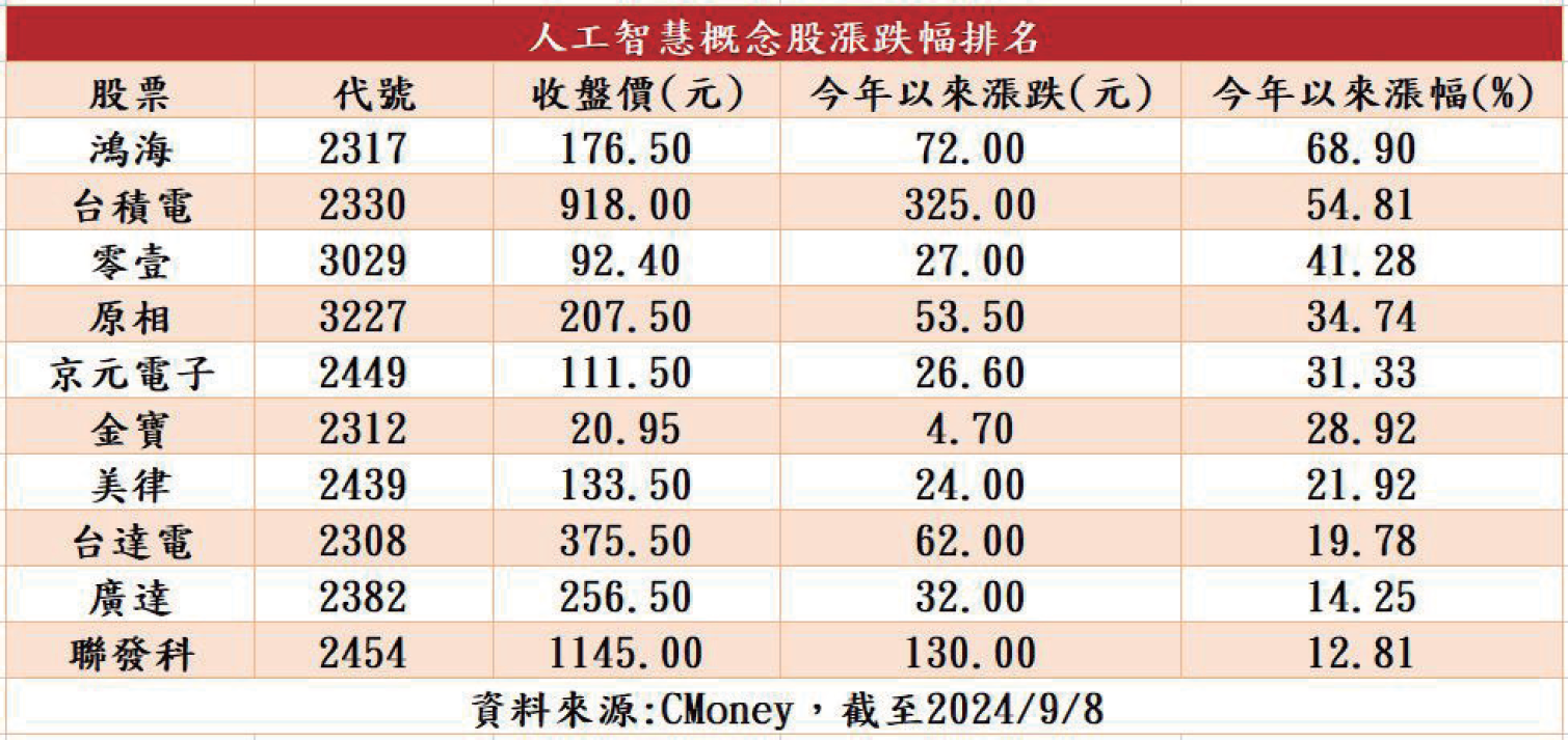 2024國際半導體展(SEMICON Taiwan)盛大落幕,多家台廠大秀先進技術,展現台灣於國際半導體產業中的關鍵地位。除了基本面的發展,在技術面上台股也迎來AI元年爆發期,今年股價成長幅度第一名為代工大廠鴻海(2317),今年漲幅高達68.9%,被譽為護國神山的台積電(2330)漲幅也逾50%。