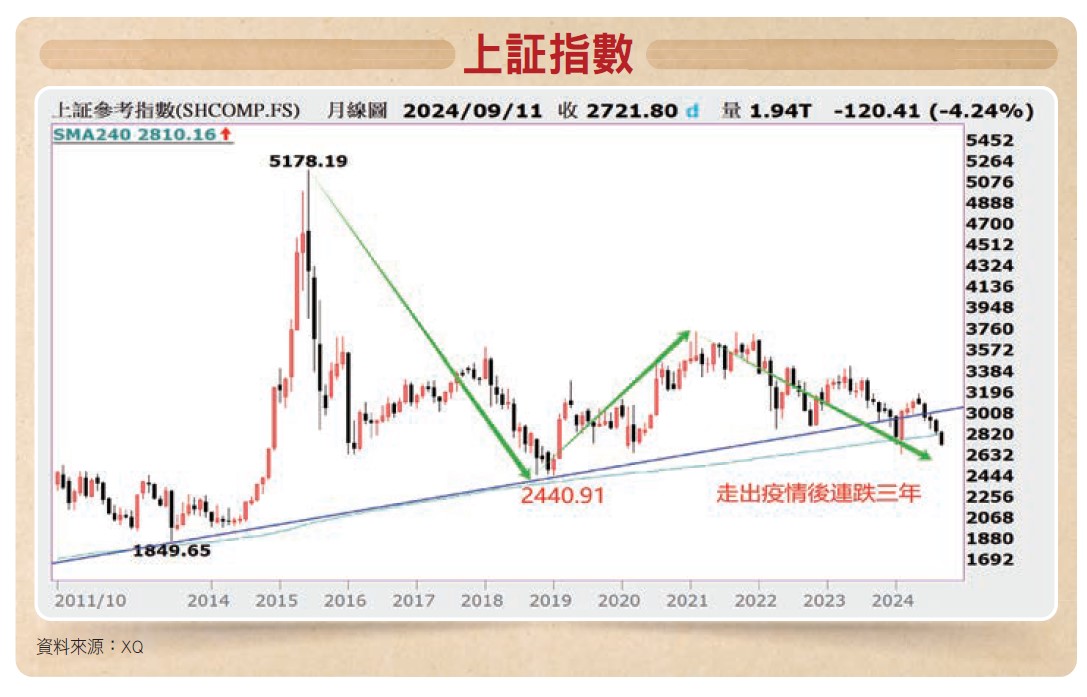 說到對未來的盼頭,大概沒有比滬深股市的股民更加無奈,走出三年的疫情後,上証指數是少數連續三年不漲反跌的市場,2022年跌-15.13%,2023年跌-3.7%,2024年至今(9月11日)跌-8.51%,今年兩度跌破2005年998.23低點連接2013年1849.65低點所形成的超長期上升趨勢線支撐。