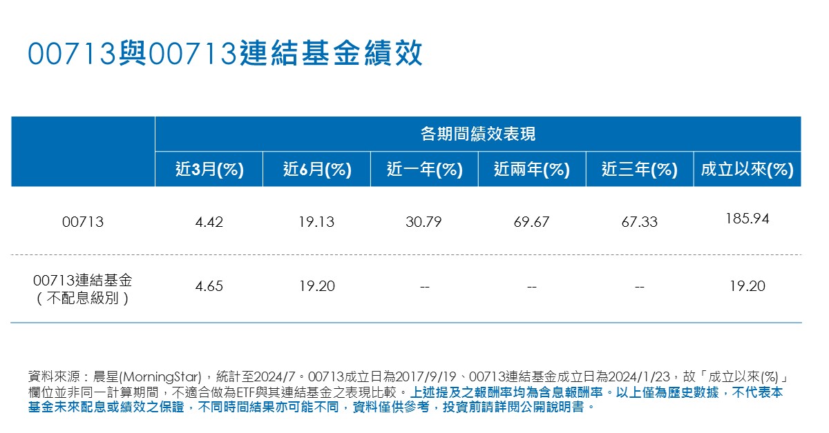 元大投信指出,對於距離退休時間長達30至40年的年輕存股族,更可以善用股息再投資擴大複利效果潛力,00713目前亦有「00713連結基金*」提供不配息級別選擇。00713連結基金主要投資00713 ETF,以連結00713績效表現為目標,透過元大投信、基金平台、銀行等銷售機構,就能以申購共同基金的方式投資00713。