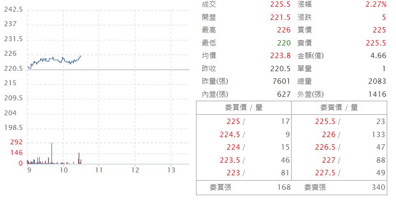 士電今(23)日開盤價221.5元,盤中最高觸及226.0元,目前股價暫報224.0元,漲幅1.59%。