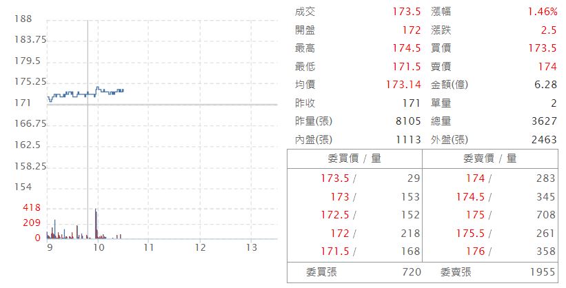 中興電早盤以172.0元開出,目前股價為173.5元,漲幅1.46%,維持震盪。