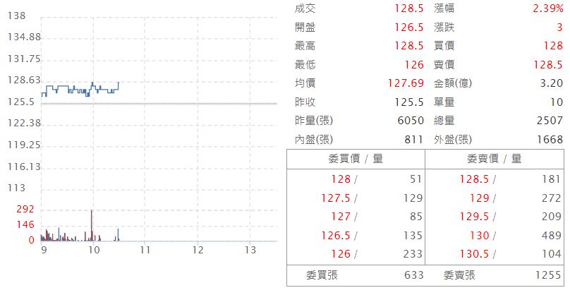 亞力早盤開在126.5元,股價暫報127.5元,漲幅1.99%。