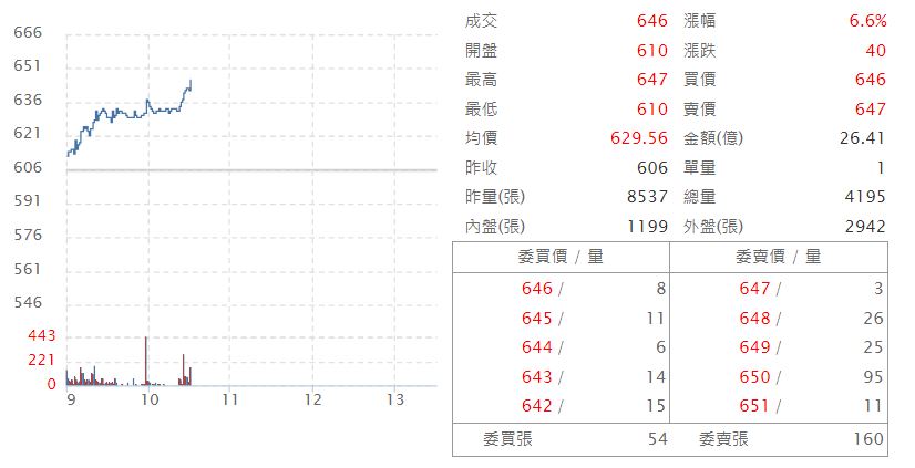 華城漲最兇,開盤價為649元,盤中股價震盪向上,暫報649元,漲幅7.10%。