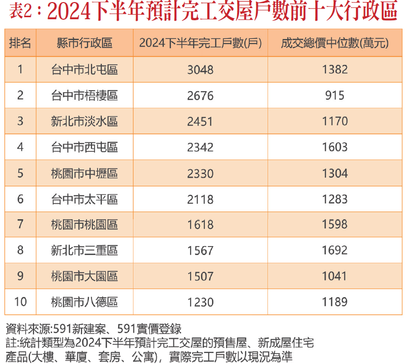 根據統計,今年下半年交屋戶數最多的區域由台中北屯奪冠,有超過3000戶量體即將完工,緊接在後的同樣是位在台中的梧棲,下半年預計交屋戶數2676戶,第三名則為新北淡水,下半年有2451戶量體即將完工,至於台中西屯區也有超過2000戶要交屋。