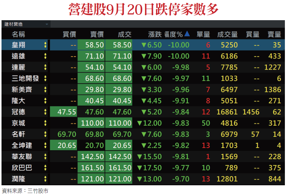 這是央行第七次的信用管制,被視為歷史上最嚴厲的打炒房措施,影響所及是今年股價漲翻天的營建類股,在隔天9月20日應聲下跌,收盤時有20多檔營建股「跌停」,包括:皇翔(2545)、隆大(5519)、遠雄(5522)、新美齊(2442)、京城(2524)、達麗(6177)、欣巴巴(9906)、三地開發(1438)、潤隆(1808)、全坤建(2509)、華友聯(1436)、永信建(5508)、大城地產(6171)、新潤(6186)、富宇(4907)、瑞築(6198)、富旺(6219)、綠意(2596)、鑫龍騰(3188)、森寶(3489)、聯上(4113)等建商,另代銷界龍頭的海悅(2348)也是綠油油的(如附圖)。