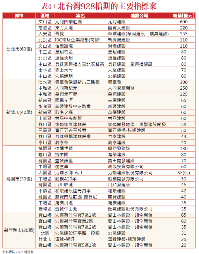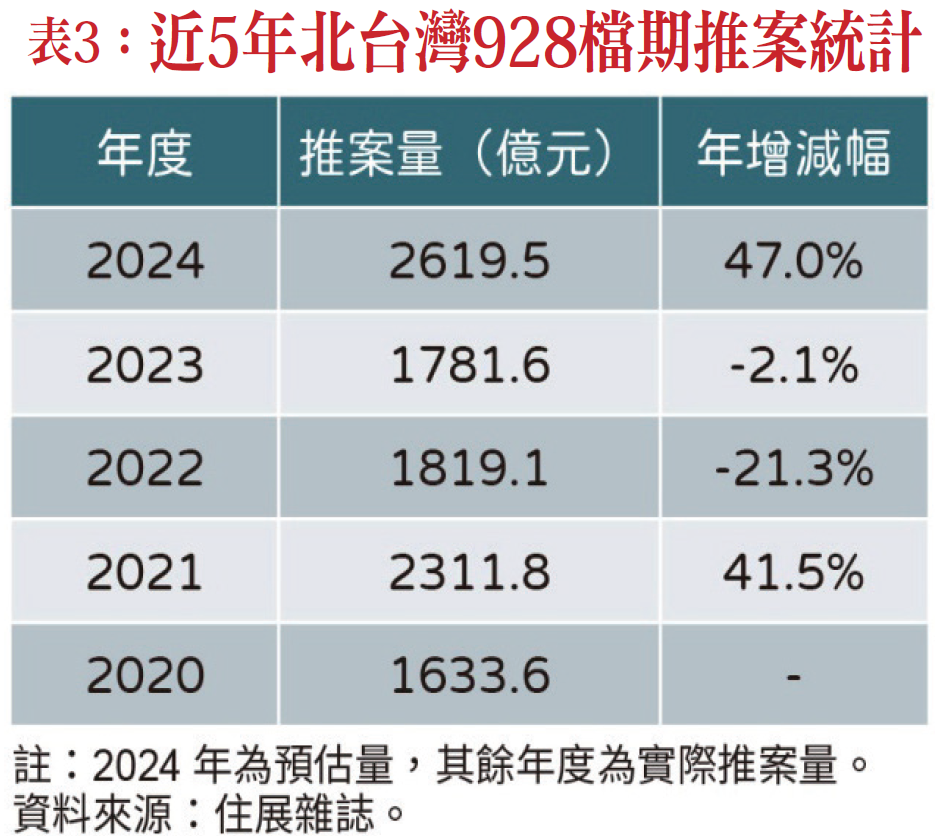 另根據專門統計北台灣房市資訊的《住展雜誌》統計,住展雜誌統計今年北台灣房市928檔期推案預估量,來到約2619.5億元,較去年同期實際推案量成長約837.9億元,年增47%,且北北桃八大百億新案發發發(表三)。