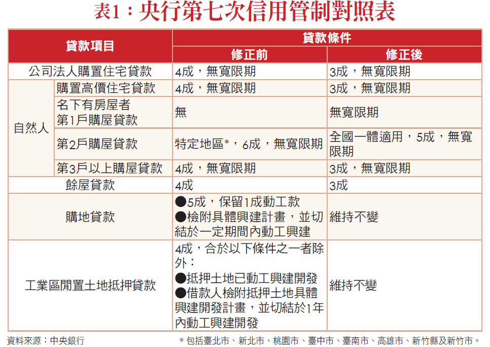央行這一波的打炒房管制措施,主要內容包括:一、新增規範自然人名下有房屋者之第1戶購屋貸款不得有寬限期。二、自然人第2戶購屋貸款最高成數由6成降為5成,並擴大實施地區至全國。三、公司法人購置住宅貸款、自然人購置高價住宅貸款及第3戶(含)以上購屋貸款之最高成數由4成降為3成。四、餘屋貸款最高成數由4成降為3成(表一)。