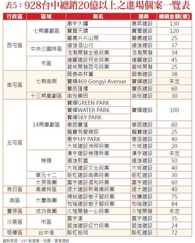台中近年產業、交通、建設迅速發展,包括頂級飯店、企業總部、大型百貨積極進駐,帶動大量人口紅利,今年928檔期更有約1500億元的預售逾宅推案量,另光是總銷20億以上的中大型預售案,就有27個案子即將進場(表五)。