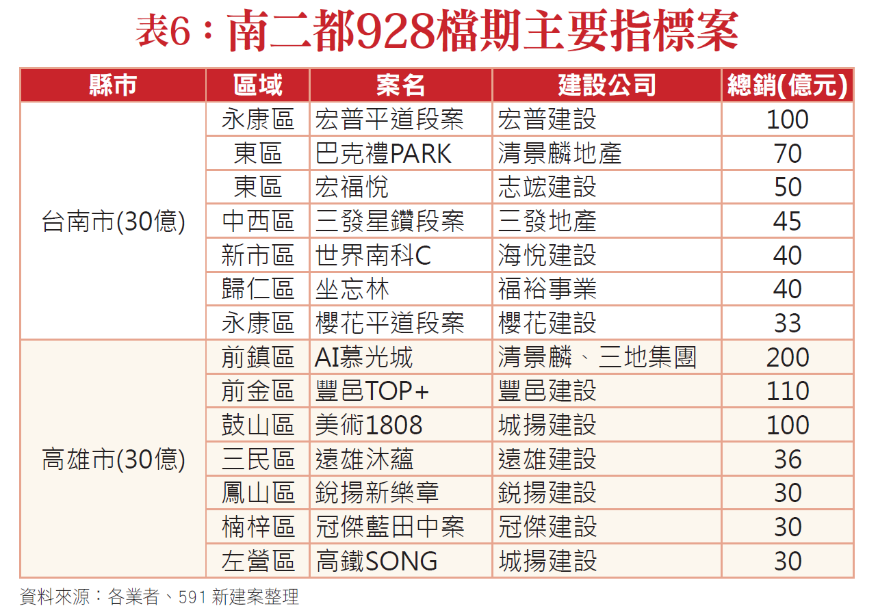 這幾年熱到不行的南二都,今年928檔期的推案也見多個百億大案,像台南市因去年基期較低,今年除了在永康區有百億指標案登場,南科周邊也有量體逾百戶的大樓案登場,帶動量能反攻至500億元以上(表六)。