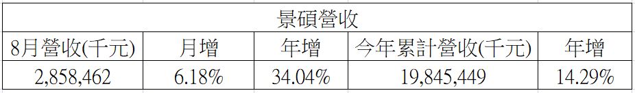 景碩8月最新營收為28.5億元,月增6.18%,年增34.04%,連續5個月成長;今年1到8月累計營收為198.4億元,年增14.29%。最新EPS為0.2元,季增300.0%,近四季EPS為0.29元。