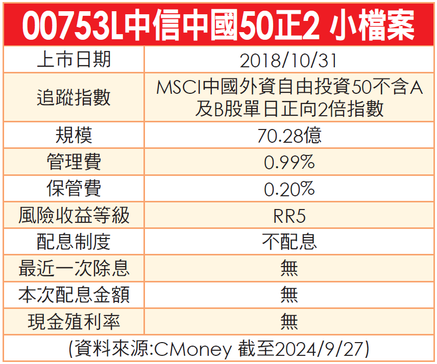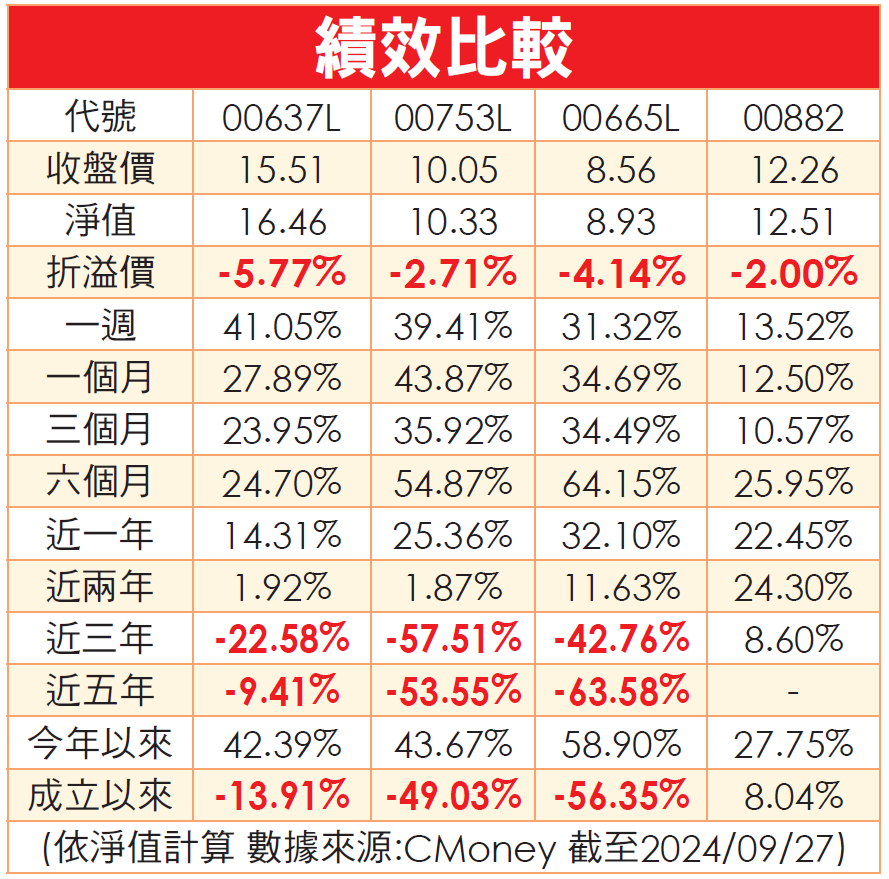 從績效比較來看,近期的報酬率皆相當可觀,由於前三支皆為正向2倍槓桿型的ETF,因此在中概成份股皆大漲的情況下,報酬率會比00882更高出許多,但相對地,若成分股下跌,所承擔的風險也將會是倍數增長,成為須看準方向的「雙面刃」 。