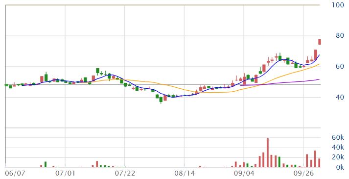 身為矽光子族群的創威(6530)也受惠,連四日股價攻高,今(4)日開盤價74.4元,盤中多方力道強勁,順利攻上漲停板,漲停價77.8元,漲幅9.89%,截至上午11點32分成交量為17641張,線型為多頭趨勢。