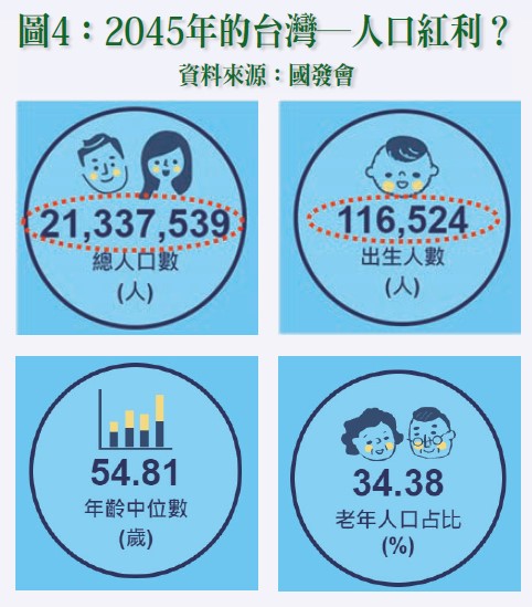 2.2045年總人口2133.75萬人,出生人數11.65萬人,年齡中位數54.81歲,老年人口占比34.38%。(詳請參閱圖四)