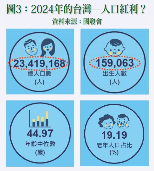 1.2024年總人口2341.92萬人,出生人數15.91萬人,年齡中位數44.97歲,老年人口占比19.19%。(詳請參閱圖三)