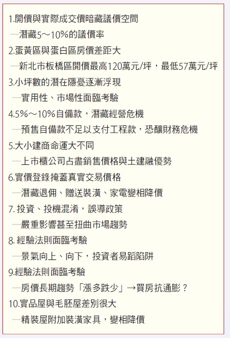 近年常見媒體順應業者行銷術語刊載「房價沒有最高,只有更高」,或者「已經無房可賣」,甚至還有從業人員更直截了當的驟下結論「在此之前看空的全錯」等論點,尤其電視談話性節目經常出現「這次所講的跟上次觀點好像都差不多」等評語,之所以會出現這種情況,實與2018年以來房價幾乎只呈現只漲不跌,並且近乎可以預期的趨勢息息相關,導致整體市場從北到南處處可以看到100%完銷的廣告;此外,不只一般民眾所寄望政府能夠儘速擬定一套有效的壓抑對策一再落空,2023年8月1日還推出助長房價的新青安優惠房貸政策;及至今年9月19日央行理監事會議之後才祭出第七波選擇性信用管制措施,顯然政策擬定又慢了半拍;當前雖然股市還處於高點,惟房市景氣在央行政策強力壓抑下,必然會出現反轉趨勢!