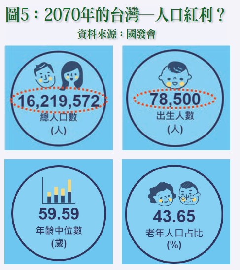 3.2070年總人口1621.96萬人,出生人數7.85萬人,年齡中位數59.59歲,老年人口占比43.65%。(詳請參閱圖五)
