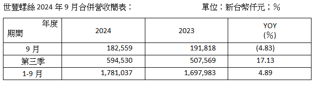 螺絲大廠世豐螺絲股份有限公司〈2065〉於今日公布2024年9月合併營收達1.83億元,較去年同期減少4.83%。累計2024年第三季營收達5.95億元,年增17.13%。累計2024年1至9月營收達17.81億元,年增4.89%。