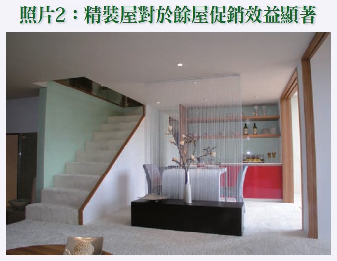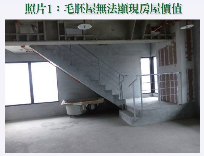當前另一值得重視的是實品屋與毛胚屋(詳請參閱照片一、二)的問題,一般而言,建案在預售階段大都是以樣品屋進行促銷,銷售現場公開展示建案模型、建築結構、規劃設計與建材設備等,由於接待中心都會裝修得美輪美奐藉以吸引購屋者訂購,但在這波大量建案並未100%去化情況下,必然在交屋階段還有不少待售餘屋,而這也正是建案會運用精裝屋進行變相降價促銷的主要緣由;因此,對於完工後的建案往往就會出現精裝屋遠較毛胚屋好賣的折扣與讓利等變相降價問題,此就購屋貸款而言,無形中又是銀行鑑價核貸的一大考驗。