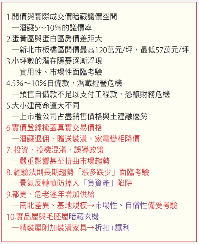 值得重視的是,貿然將竹科經驗複製到中南部地區,後續產業投資、就業人口以及交通建設等問題都如果沒有逐一入考量,一旦景氣反轉,議價空間越來越大,不僅預期利潤無法實現,也有可能掉入「負資產」陷阱!其次,另一值得關注的焦點議題為原購屋所依循的實價登錄,更應注意其間所隱藏5%~10%的議價空間與讓利的潛在問題!