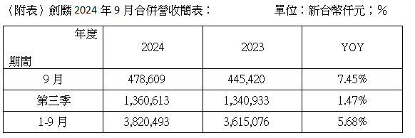 展望2024年第四季,劍麟持審慎樂觀看法。劍麟戮力深化汽車事業主要客戶業務合作,並持續與客戶共同研發新款車用安全件產品開發設計,帶動目前集團整體在手訂單站穩良好水準,在客戶保持穩健訂單拉貨需求下,有助於創造整體營運正面加分效果,此外,集團持續採取高值化車用安全件產品開發設計、設備智能化與工廠智慧化發展,皆有助於帶動集團整體接單動能保持良好水準,以期帶動未來營運良好銷售表現。
