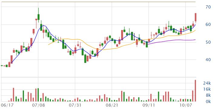 上櫃電子股陽程(3498)今(14)日早盤開在62.0元,盤中多頭力道強勁,股價震盪向上,攻上漲停板,漲停價9.93%,今日成交量為28400張,目前仍有近一萬張買單排隊等候中,線型為多頭趨勢。