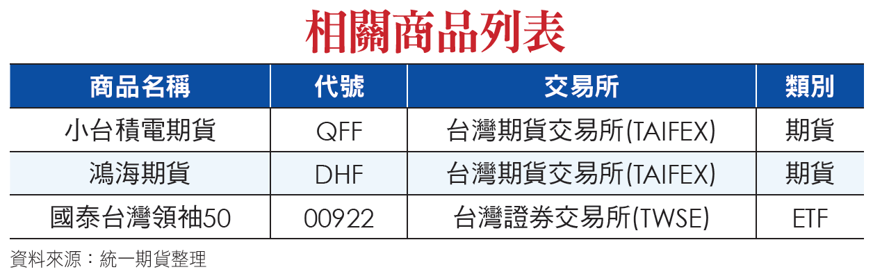 在選擇標的上,如前文所述,可優先選擇龍頭企業,可享受到資金磁吸的效應,具有相對穩健且具有成長空間的優勢。如台積電期、鴻海期等,也剛好搭上近期AI熱潮趨勢。若偏好現股也有相關標的,如國泰台灣領袖50(00922)等,把握農曆年前絕佳布局時點,迎接旺季到來!