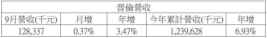 晋倫9月最新營收為1.2億元,月增0.37%,年增3.47%;今年1到9月累計營收為12.3億元,年增6.93%。最新EPS為0.53元,季增112.0%,創9季新高,近四季EPS為1.48元。
