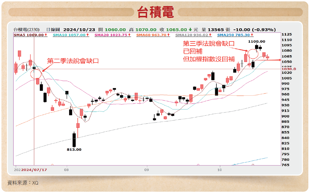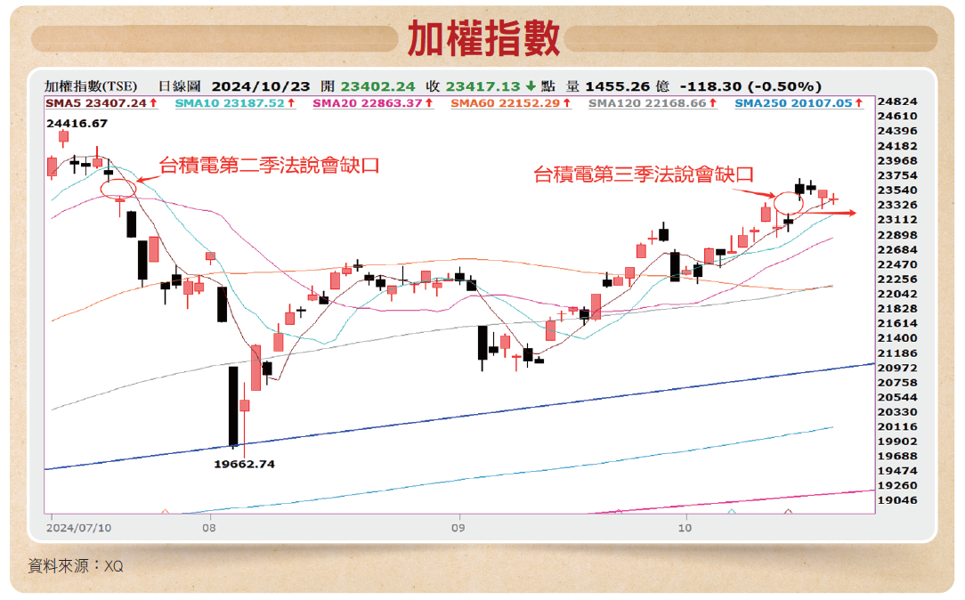 時序進入美國科技巨頭超級財報周,AMD 10月29日、Meta 10月30日、蘋果10月31日,在壓軸的輝達11月19日公布之前,多頭將迎戰11月5日美國總統大選、11月7-8日FOMC利率會議,過了這關後,就是11月15-16日的APEC經濟領袖峰會,兩岸領袖代表可以同台交流的國際場合,這次代表賴總統出席的是林信義,被黨政人士解讀為對中國釋善意,在中共第二次圍台軍演後能否轉為良性互動,將為年底聖誕老人行情與農曆紅包行情定調。