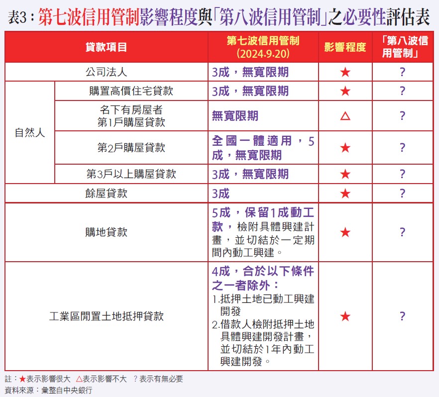 其次,此一議題如再就當前整體房市早已處於超額供給狀態,再加上央行自2020年12月3日宣布第一波信用管制措施之後,至2024年9月20日已連續推出七波信用管制,其間最主要的管制焦點大都集中在「貸款成數」與「寬限期」(詳請參閱附表三),主要用意除避免銀行信用資源過度傾斜不動產之外,更擔心建築產業因流動性風險未超前部署而衍生金融業系統性風險,進而排擠生產事業資金需求與經濟成長!