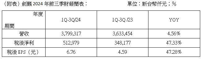 劍麟股份有限公司(2228)公布2024年前三季合併營收達新台幣37.99億元、歸屬於母公司稅後淨利達5.13億元、每股稅後盈餘(EPS)達6.76元,分別年增4.56%、47.33%、47.28%,受惠旗下汽車事業營運表現呈穩定成長態勢,挹注整體產能稼動率保持良好水準,加上今年第一季認列子公司盈餘轉增資產生之遞延所得稅回轉利益1.27億元,帶動2024年前三季營運改寫歷年同期新高之佳績。