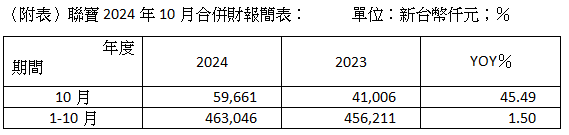 聯寶電子股份有限公司(6821)於今日公布2024年10月合併營收5,966萬元,年增45.49%,並創歷年同期新高。累計2024年1至10月合併營收4.63億元,受惠無線充電業務新品出貨放量,以及磁性元件業務穩健成長,帶動今年累計前10月合併營收較去年同期轉正成長,並年增1.50%。