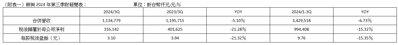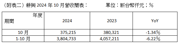 耕興今日同步公告2024年10月合併營收為新台幣3.75億元,較去年同期減少1.34%;累計2024年1至10月合併營收為新台幣38.05億元,較去年同期減少6.22%。